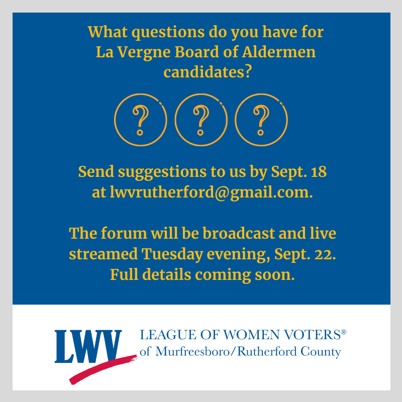 Watch on La Vergne’s City TV channel or live stream our forum as candidates for the Board of Aldermen introduce themselves and respond to a moderator's questions on a timed basis. Submit your question suggestions by Friday, September 18 by sending an email to lwvrutherford@gmail.com.